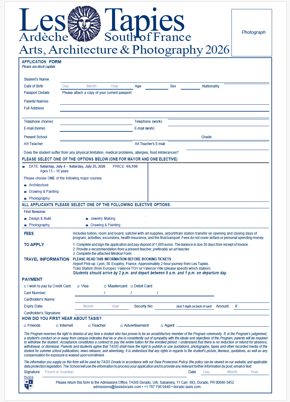 The application form must be completed and returned with a €1000 non-refundable deposit, which reserves a place in the program. A teacher recommendation, preferably from an art teacher, must also accompany the application.